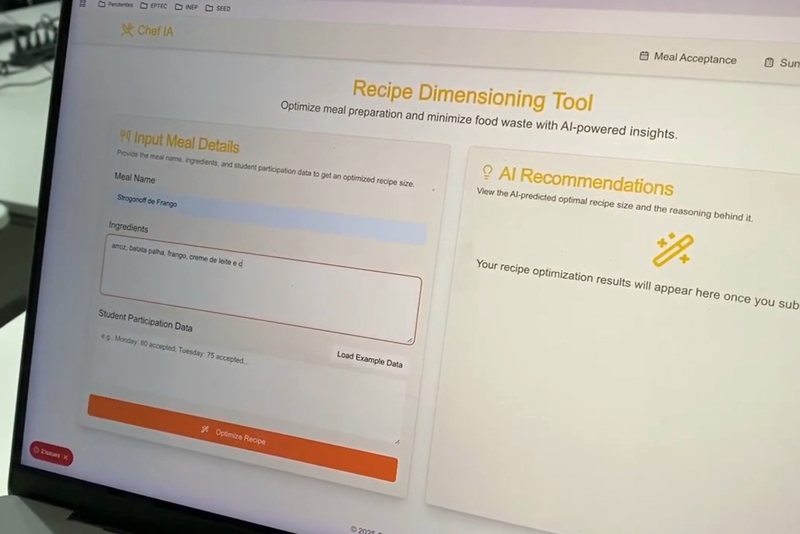 Acompanhado do professor orientador, o grupo detalhou como funciona o protótipo, que utiliza inteligência artificial para calcular quantidades adequadas de preparo a partir de informações fornecidas pelos próprios estudantes. O aplicativo permite que cada aluno registre diariamente se pretende almoçar na escola e indique preferências do cardápio. Com esses dados, a IA estima a demanda, sugere preparações e apoia as equipes de cozinha na organização das refeições.