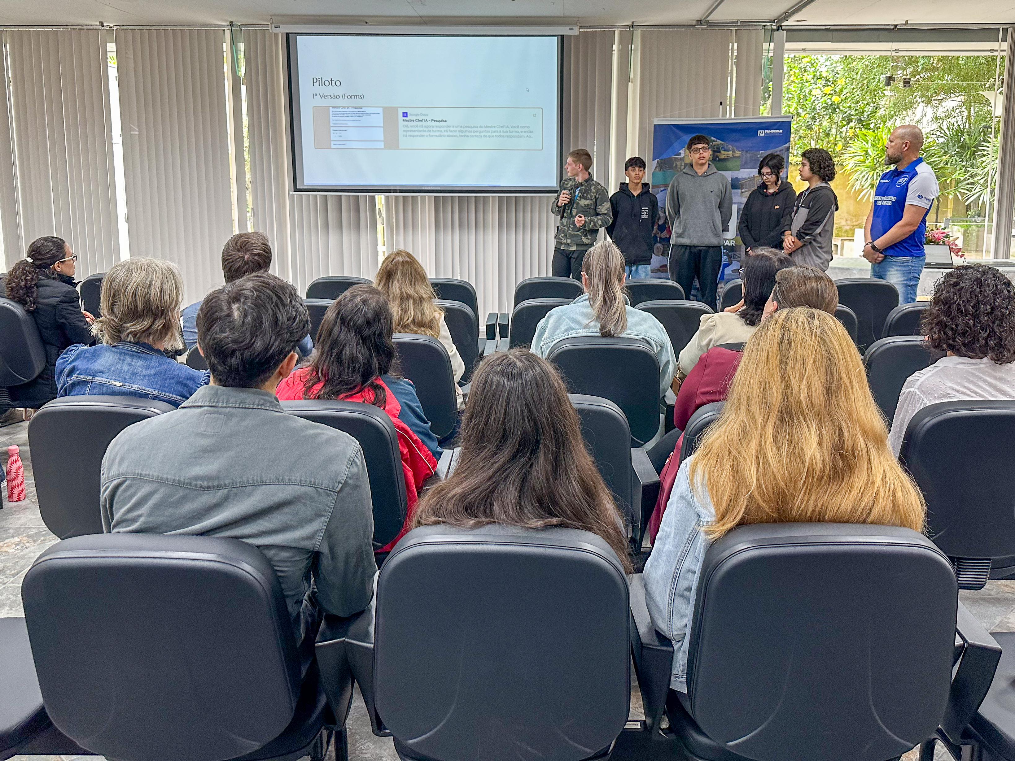 Os alunos também apresentaram o cronograma da iniciativa. Eles pretendem concluir o segundo piloto do aplicativo e finalizar a identidade visual até o fim do ano, avançar para a primeira versão completa da plataforma em fevereiro de 2026 e realizar a primeira utilização em escala no início do ano letivo, em março de 2026.